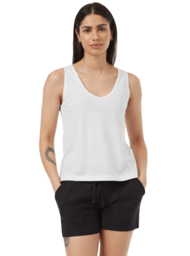 This breezy tank is light and flowy. Deep V neck at front and back, and a wide, boxy cut that is just slightly cropped. Pairs perfectly with shorts or wide leg pants.