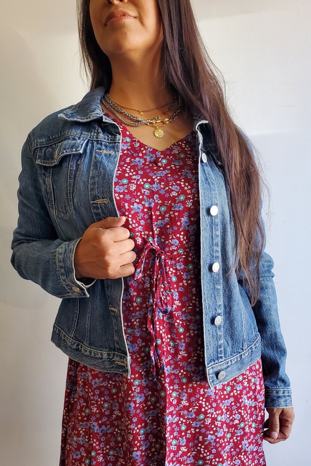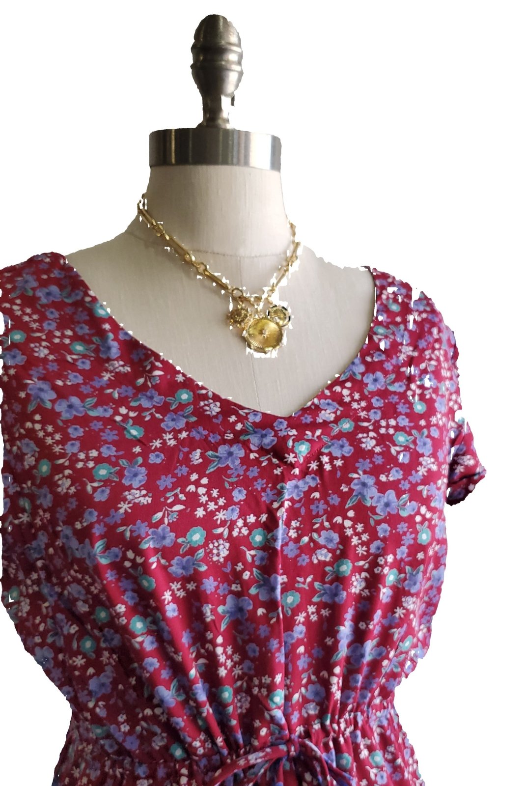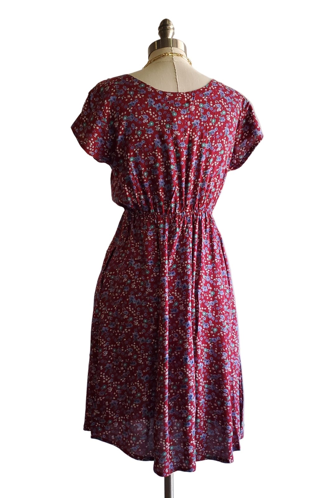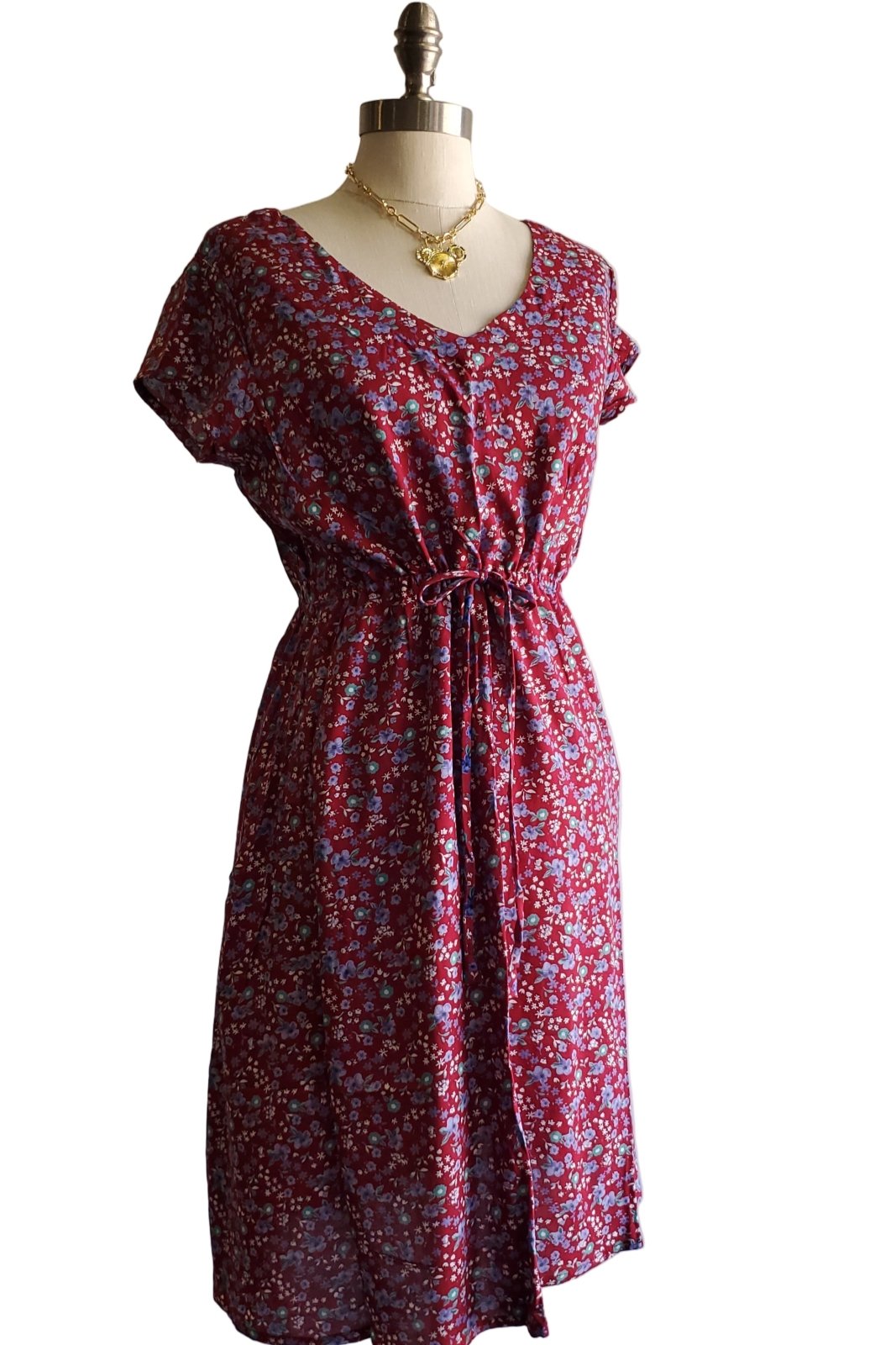Cap sleeve dress with all over mini floral print, a v-neck, self-tie waist drawstring string, and side slit pockets.