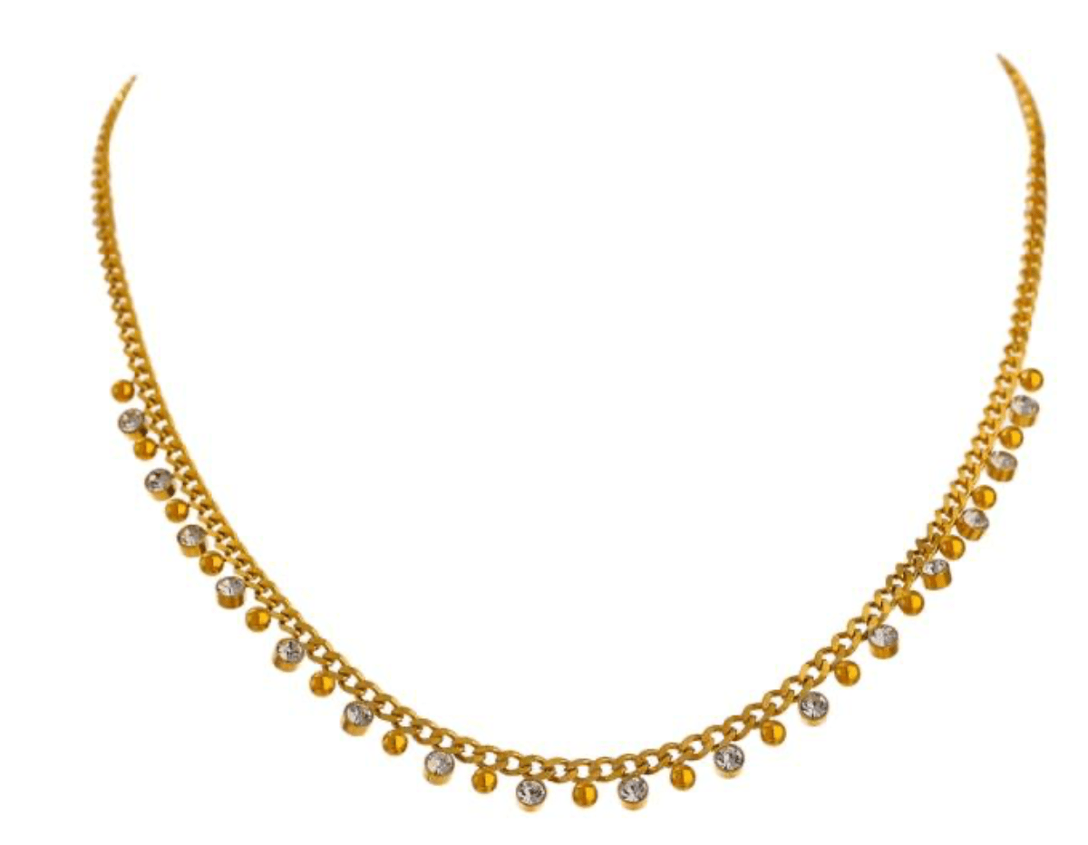 Sweetest is a ball and crystal chain necklace on Cuban chain that stacks with all your gold.  Sits flat and layers perfectly. These are hefty but not heavy they are a glass resin mix to make them the perfect CZ like stone without the weight.