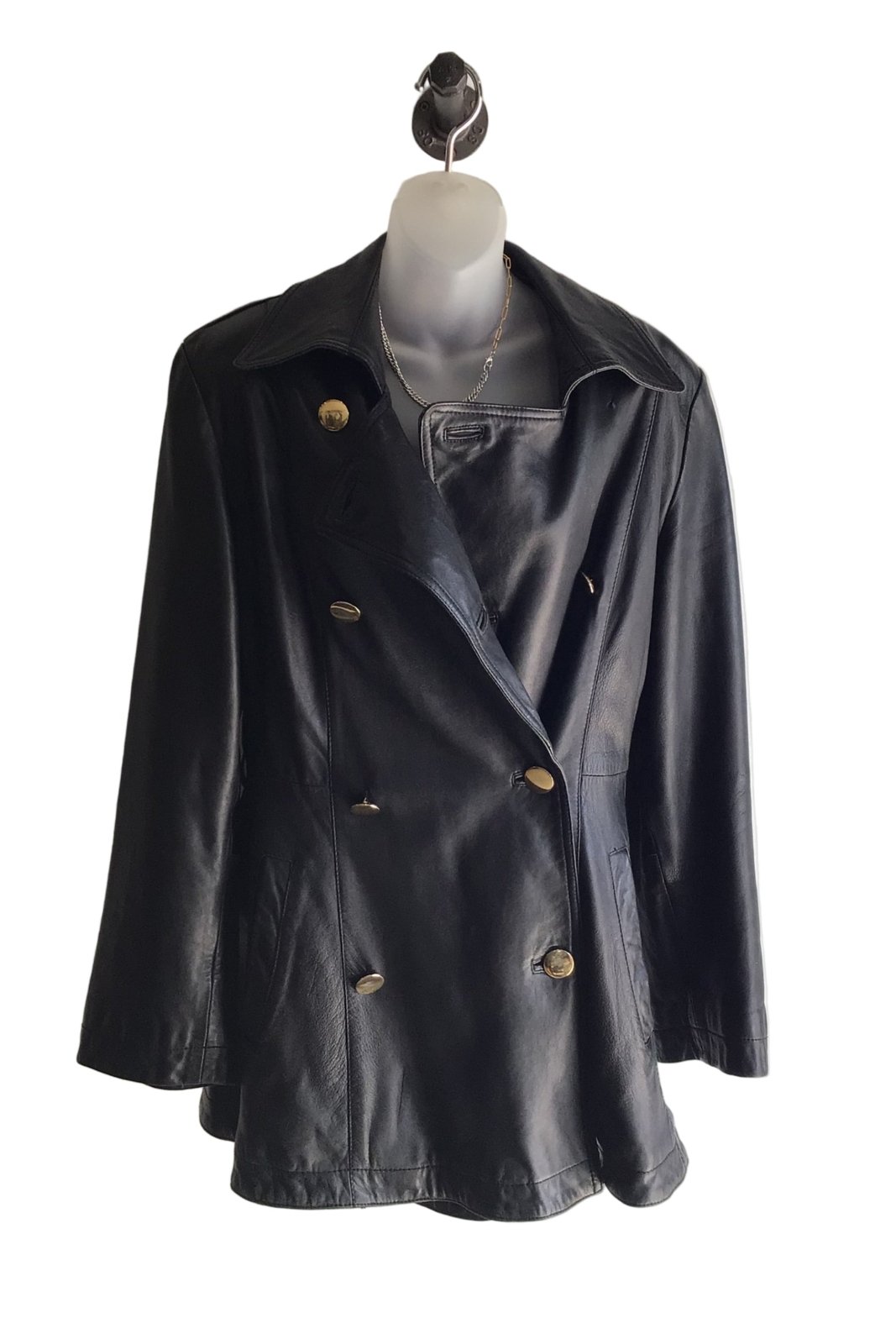 Mode and Pelle vintage leather jacket. Double breasted with gold buttons. Lining is beautifully patterned. Missing top button and original belt. Leather is soft and perfect. Fits Large/Extra Large.